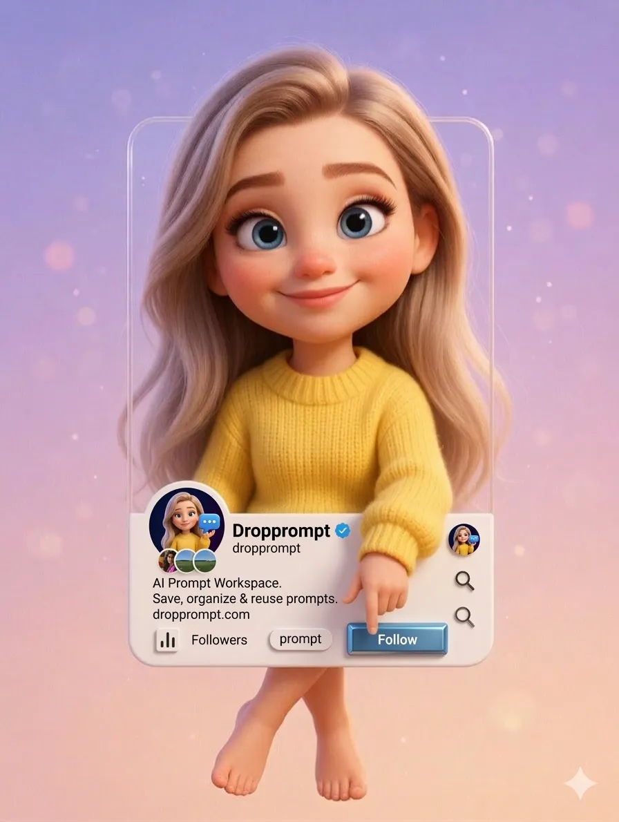 Create a cute Pixar-style 3D cartoon character sitting on a Threads profile UI frame while preserving the exact identity and facial features from a reference photo.