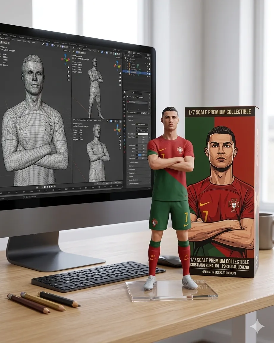 Generate a realistic 1/7 scale collectible figurine placed on a computer desk, featuring a live 3D modeling process on screen and a matching toy packaging box with original 2D artwork.