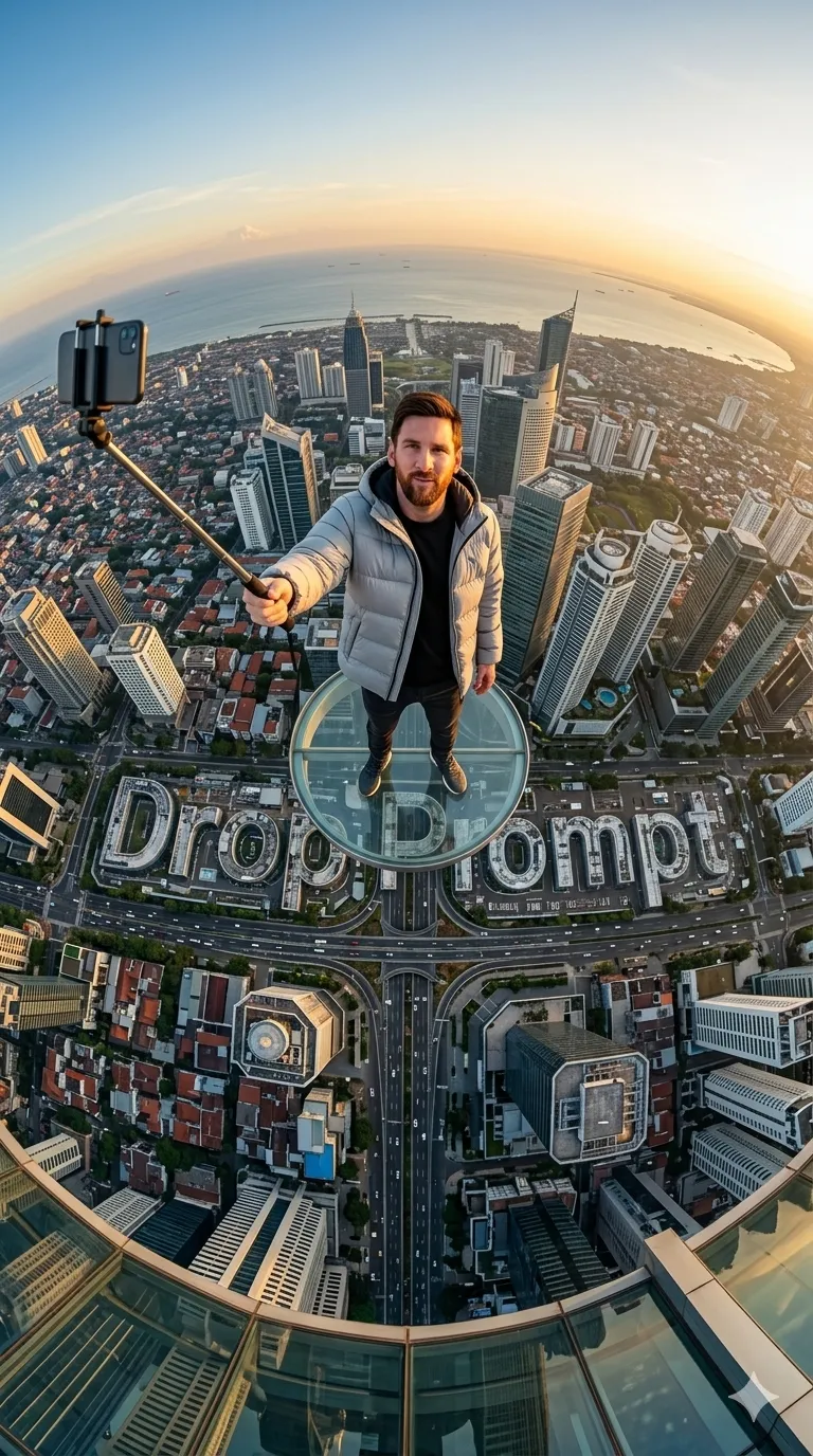 Create a hyper-realistic fisheye selfie from the top of a Jakarta skyscraper, featuring a transparent glass platform, extreme depth, and city streets forming “Drop Prompt” text.