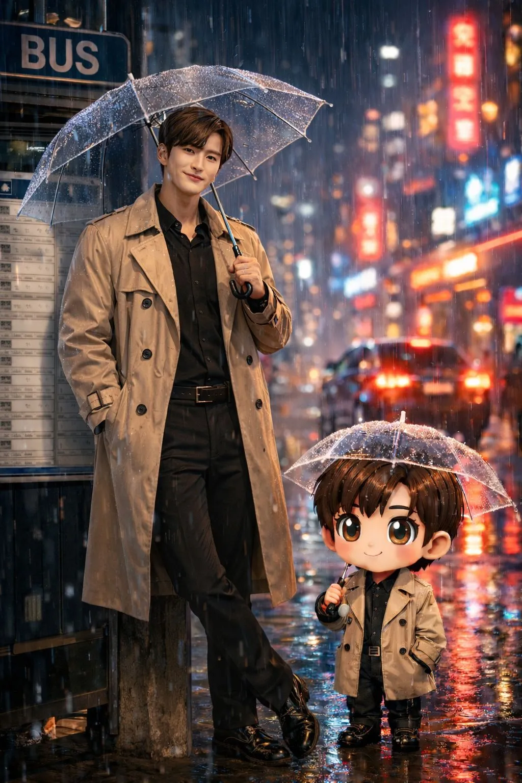 Create a dreamy cinematic rainy-night portrait featuring a stylish man under neon lights, accompanied by a cute chibi version of himself for a unique visual contrast.