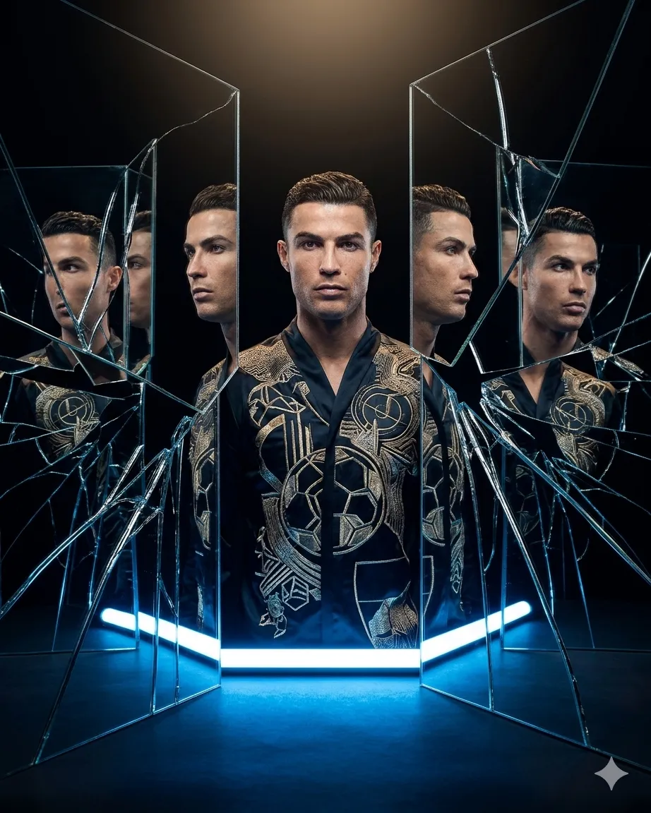 Create a high-fashion conceptual portrait using shattered mirrors to produce dramatic multi-angle reflections, with cinematic lighting and perfect identity preservation.