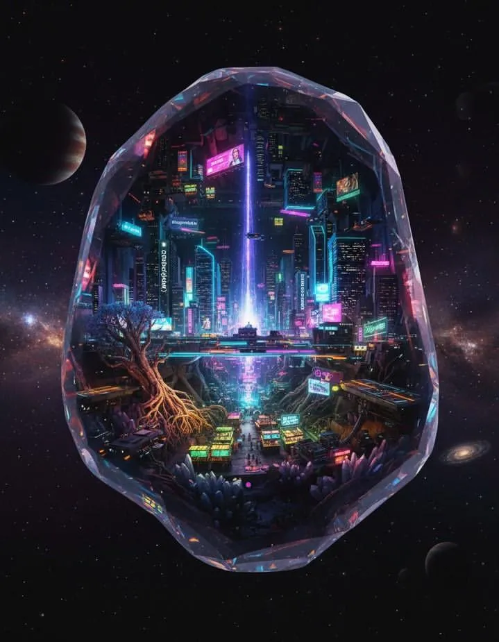Create a hyper-realistic double-exposure portrait featuring a cyberpunk city carved inside a विशाल floating crystalline geode in deep space.