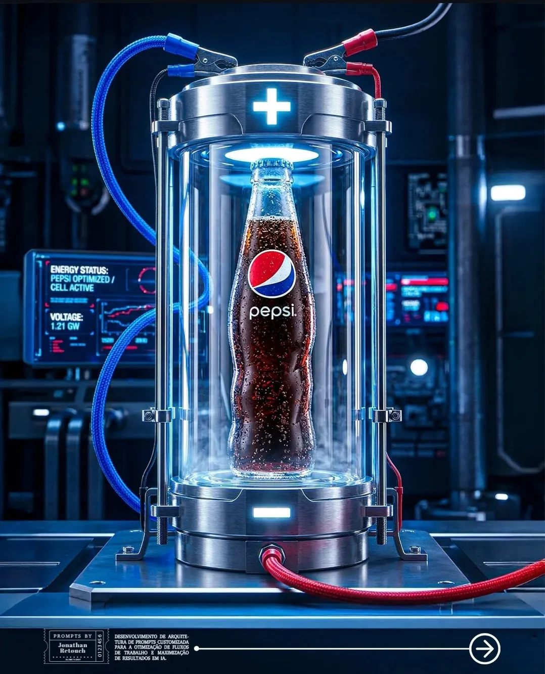 Create a futuristic product advertisement featuring a Pepsi glass bottle inside a high-tech energy chamber, designed like a powerful battery cell with cinematic lighting and ultra-realistic detail.