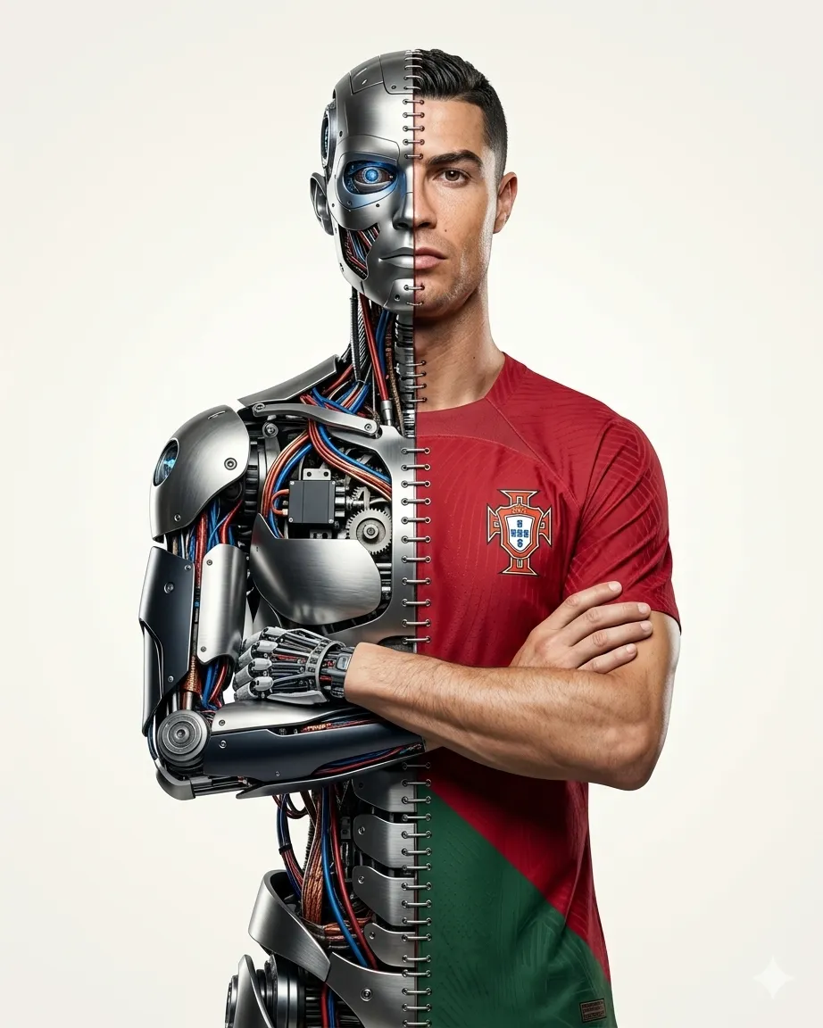 Create a striking split portrait combining half human and half robot, seamlessly stitched together with medical staples in a clean studio setting.