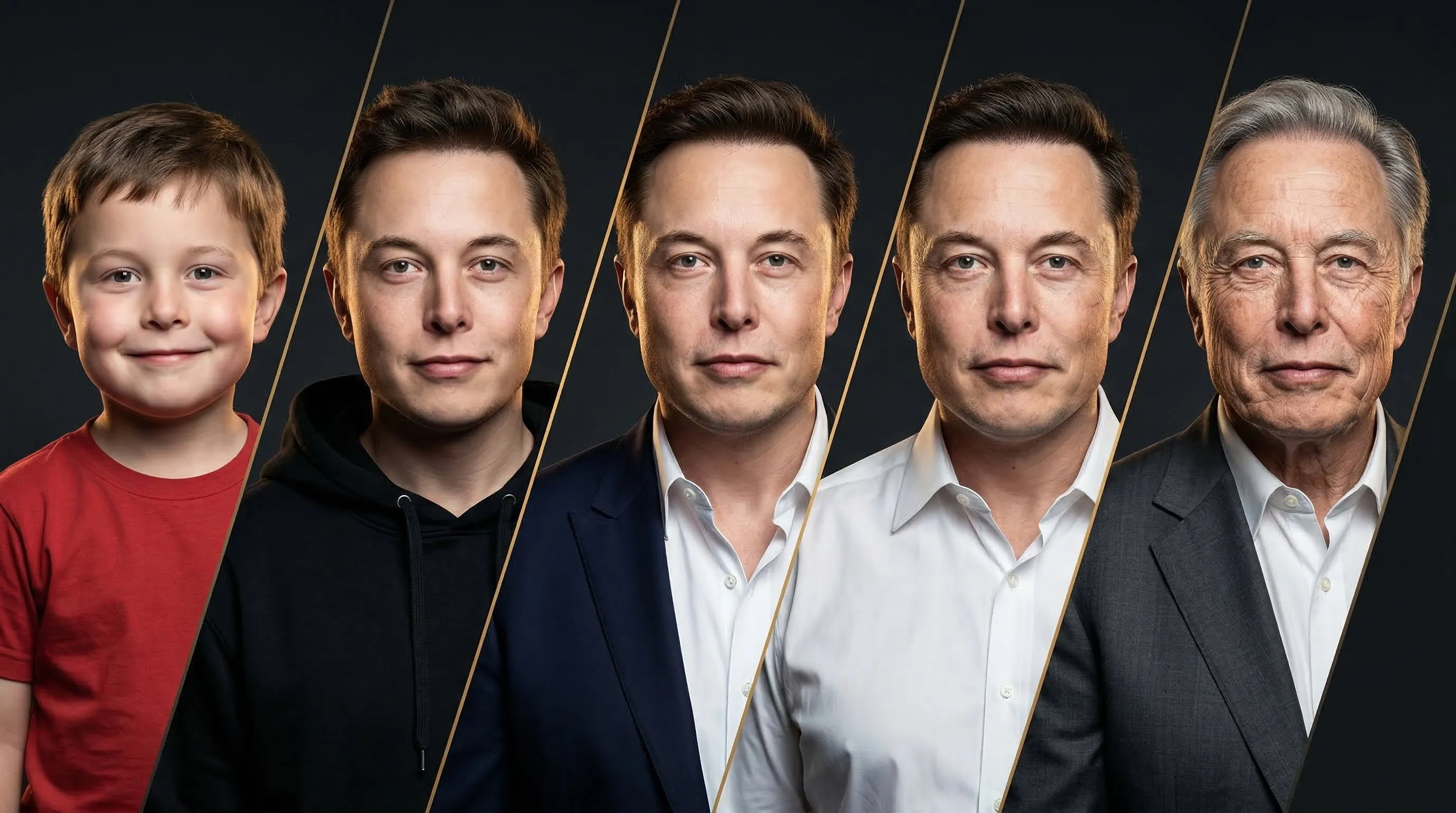 Create a cinematic ultra-photorealistic portrait showing one person across five life stages with perfect identity consistency and seamless diagonal transitions.